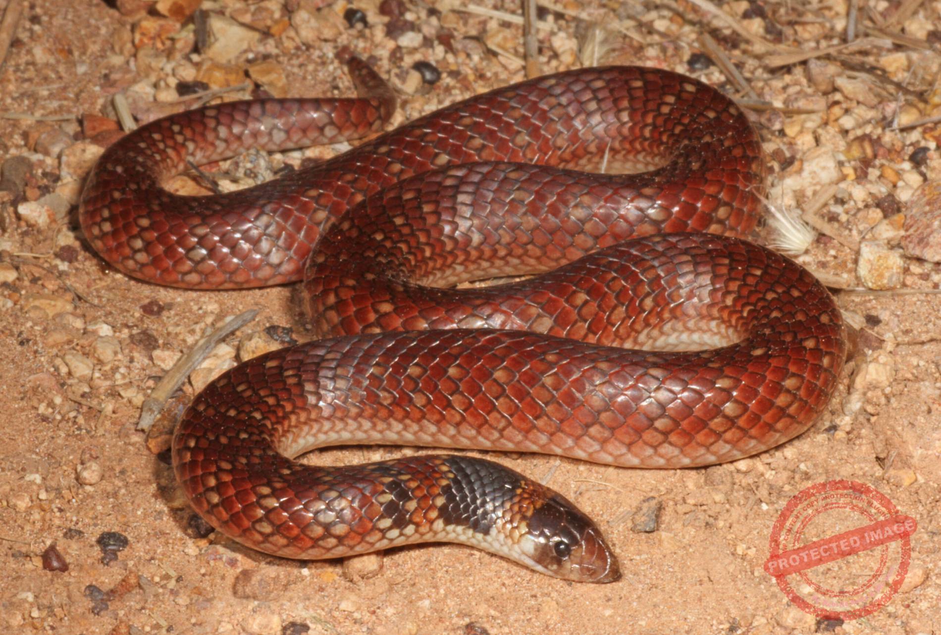 Brachyurophis australis is a diminutive snake, typically measuring between 30 to 50 centimetres in length. Its body is adorned with a pink to reddish-brown dorsal surface, accented by narrow, cream-coloured cross-bands edged in dark brown. Notably, it features two prominent dark bands: one across the head and another across the nape. The ventral surface is generally whitish. A distinctive characteristic is its upturned, shovel-like snout, an adaptation that facilitates its burrowing behaviour.​