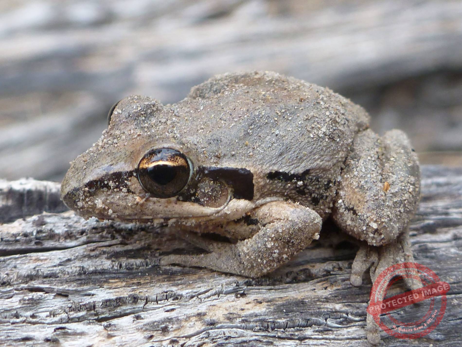 The Broad-palmed Frog is modest in size, usually growing no more than 4.5 centimetres in length. Its colouring varies between pale grey and sandy brown, with darker patches or flecks scattered across the back. A dark stripe runs from the snout through the eye and down the flank, often interrupted by a pale bar near the eye. Its underbelly is white and granular, and the inner thighs are vividly marked with yellow and black. The webbing between the toes and fingers is broad – an adaptation reflected in its name and well suited for swimming in shallow water. Though relatively plain in appearance, it becomes far more conspicuous when heard calling in chorus during the breeding season.